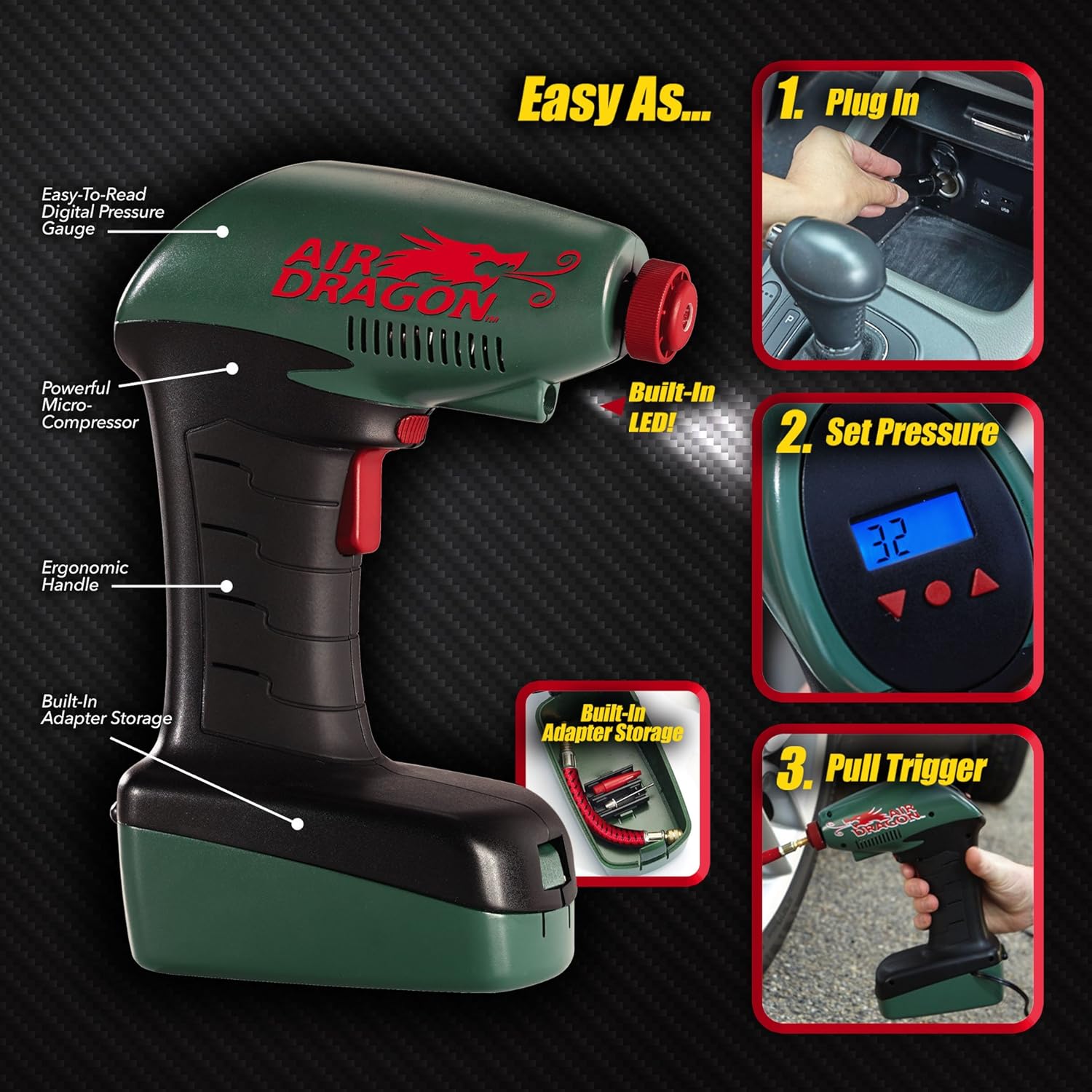 - Includes Air Dragon with built in LED light for nighttime use, 14 foot car power cable, pressure Hose, ball adapter pin, and balloon adapter pin